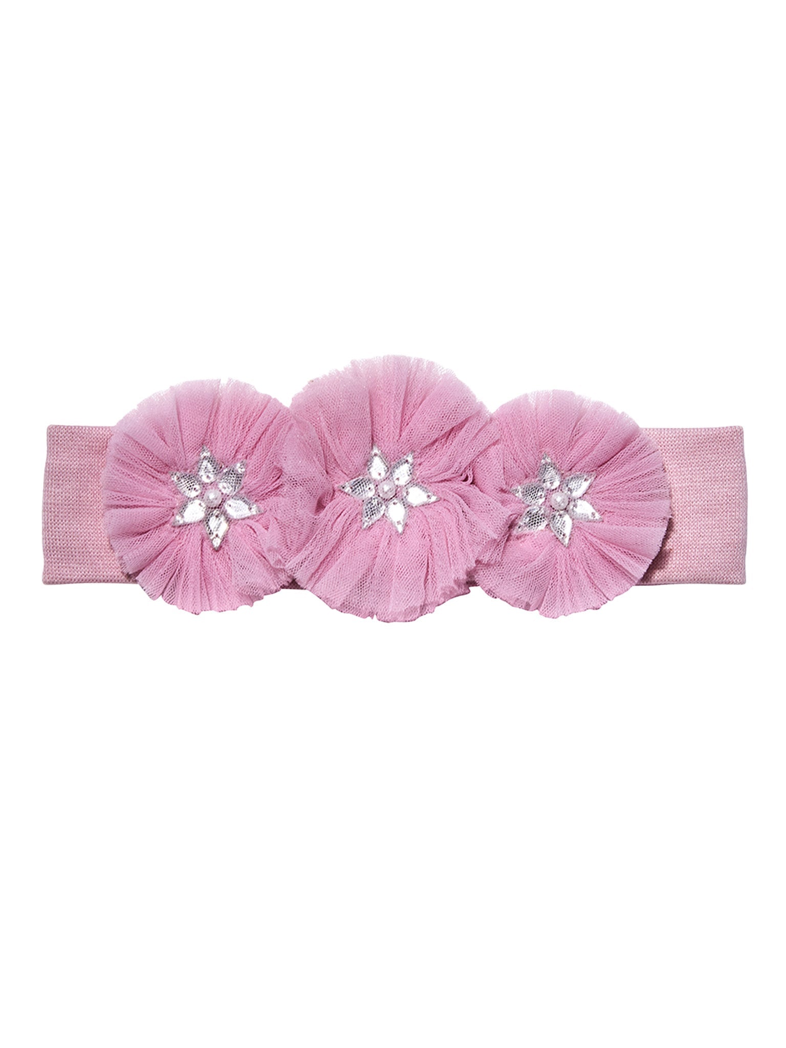 Featuring three tulle flowers snuggled side-by-side on a soft cotton jersey headband, the Bébé Snow Kissed Headband in Purple Charm is bound to surprise and delight! Each flower is delicately created with layers of tulle petals to create a stunning bouquet, and beautifully decorated in the centre with a sparkling cluster of beads to form a glittering snowflake studded with a glimmering pearl bead.