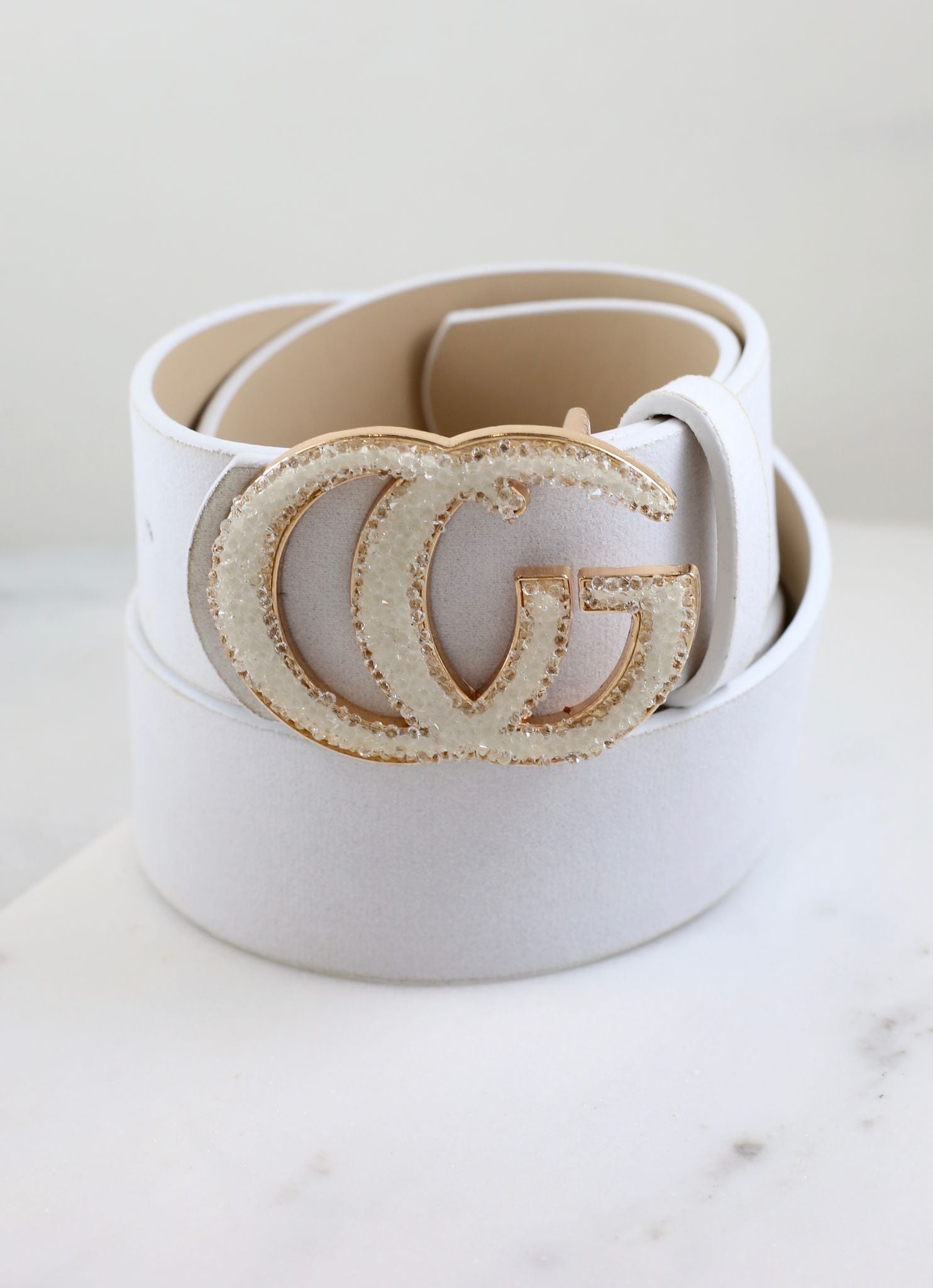 Belts are an easy way to elevate any outfit for a daytime or evening look. This belt has an embellished glittery front buckle with twelve holes. One size.