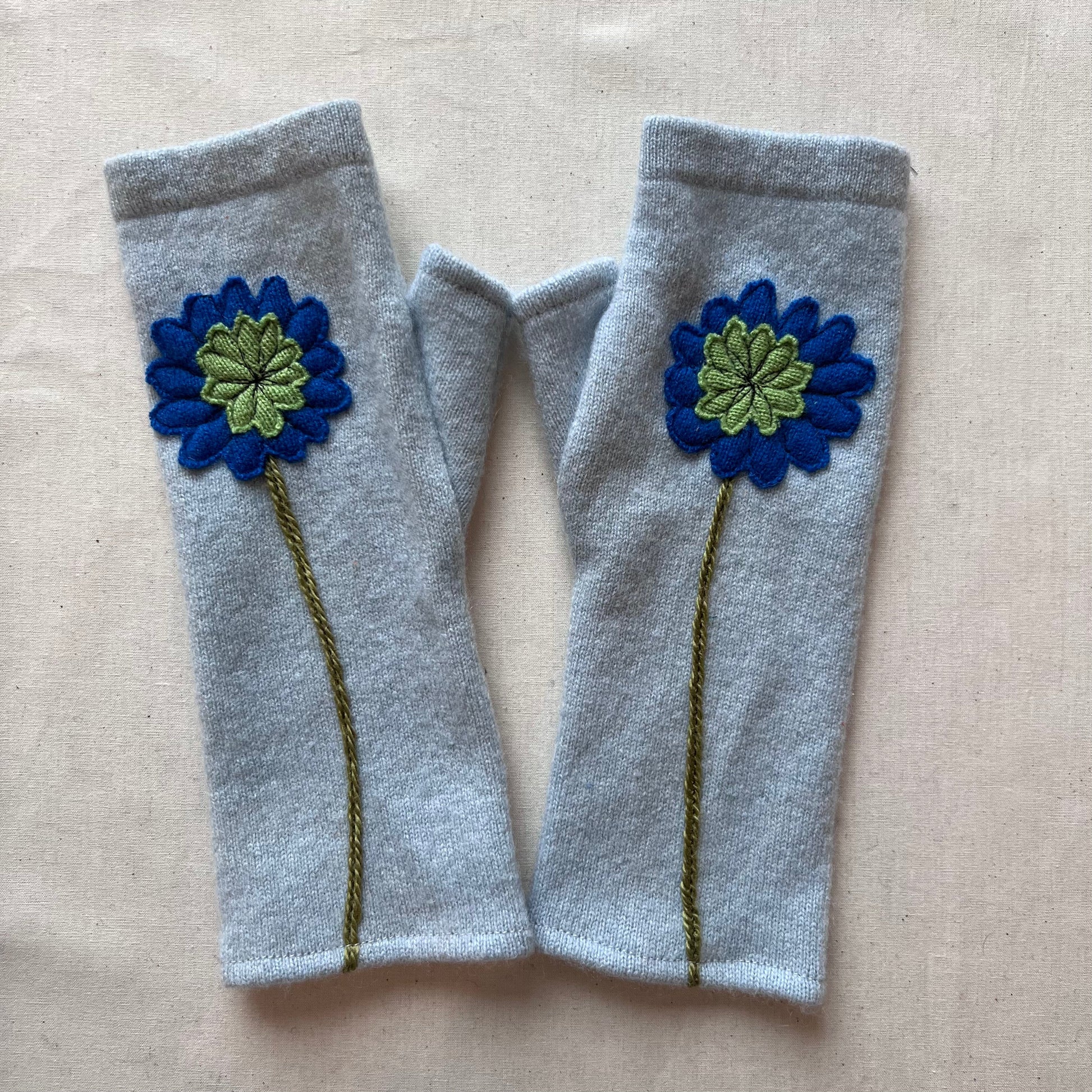 These are beautifully warm cashmere fingerless gloves. All gloves are individually made from super soft, lightly felted recycled cashmere and freestyle appliquéd so each pair is one of a kind. The open fingertop gives you the freedom to drive, text, knit, read, or drink coffee. Simply tuck your fingers inside if chilly!