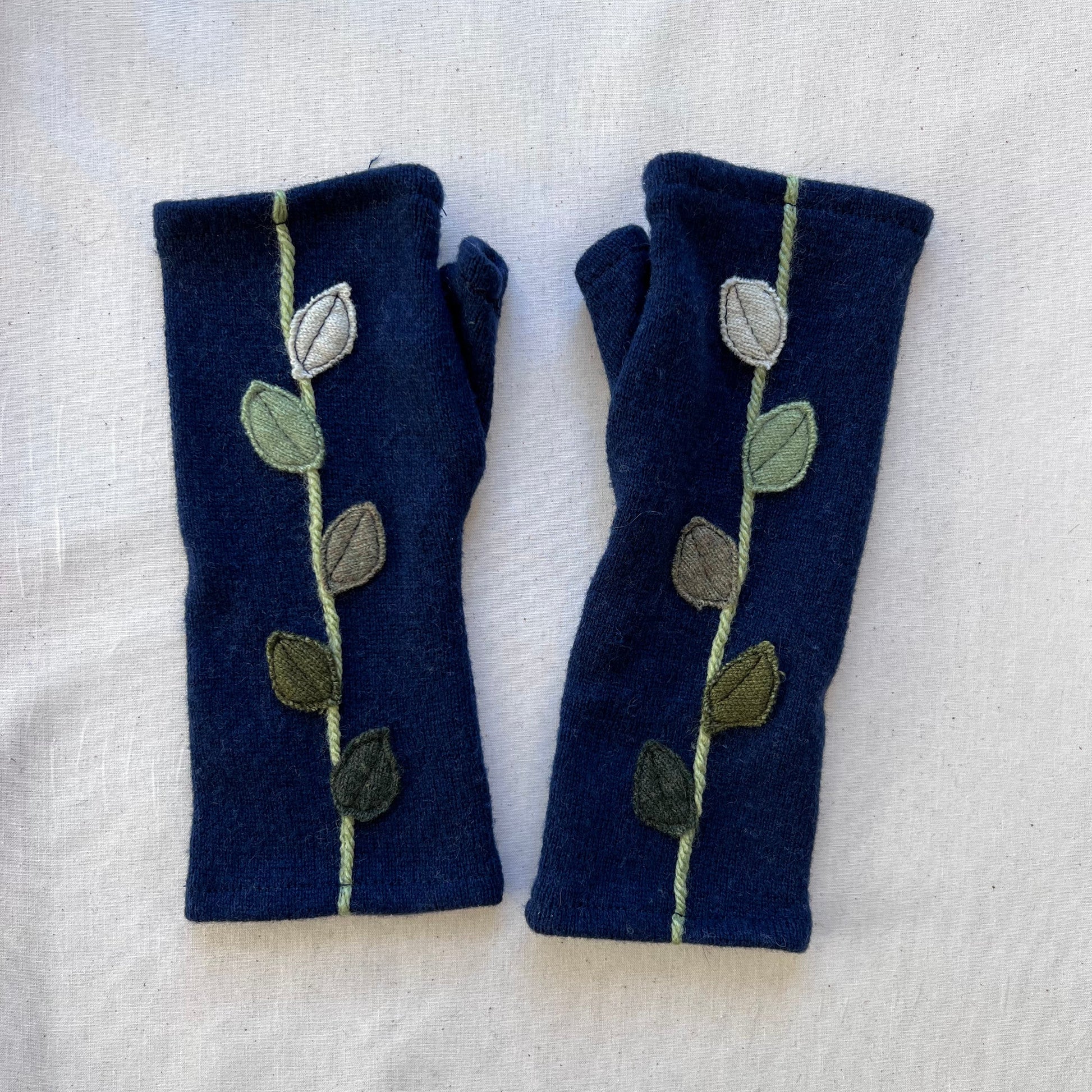These are beautifully warm cashmere fingerless gloves. All gloves are individually made from super soft, lightly felted recycled cashmere and freestyle appliquéd so each pair is one of a kind. The open fingertop gives you the freedom to drive, text, knit, read, or drink coffee. Simply tuck your fingers inside if chilly!