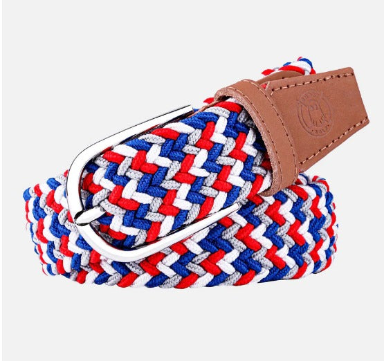- Blue/Grey/White/Red Multi Color Belt with Rounded Steel Buckle and Tan Leather Tail with Logo