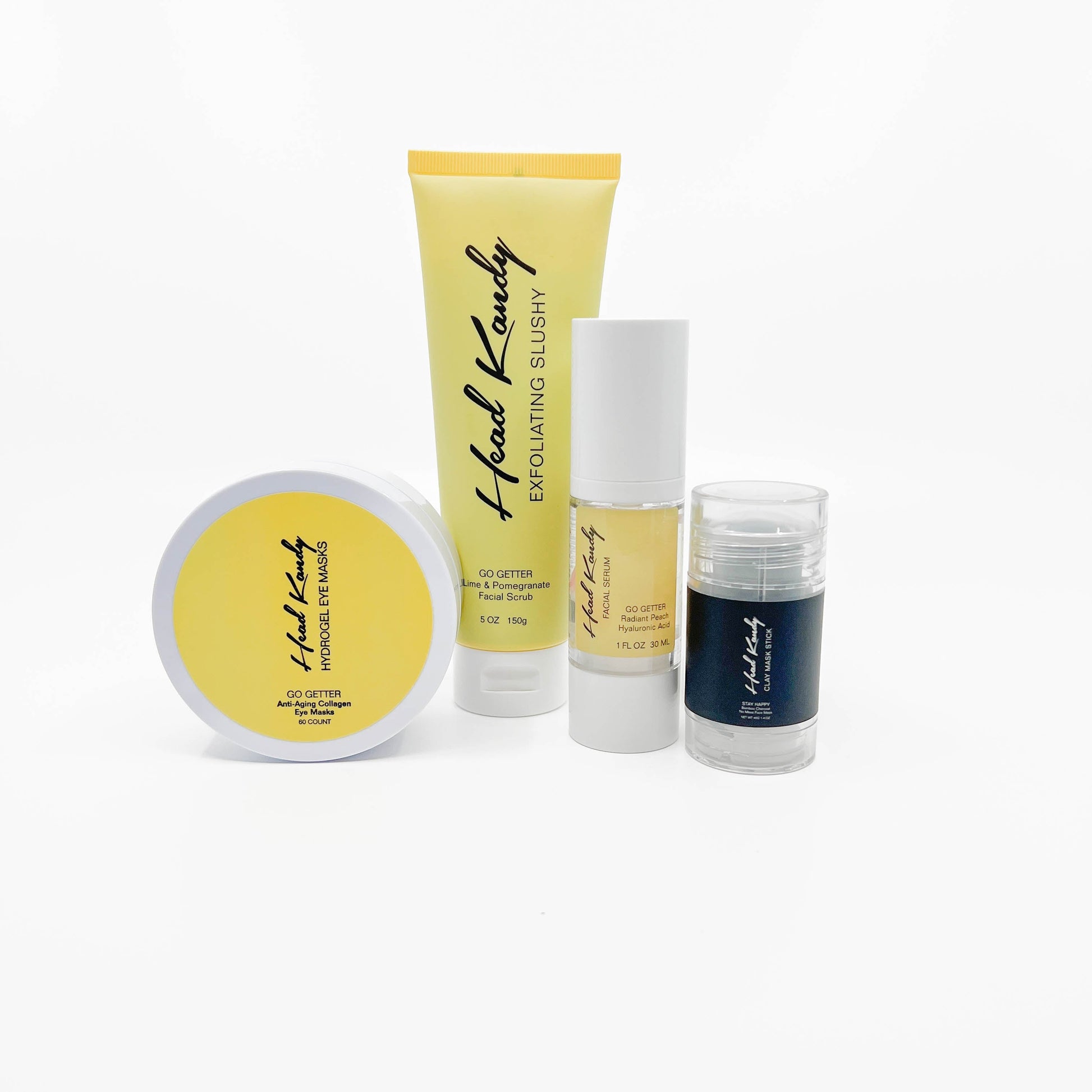 Includes: Go Getter™ Petal Serum, Lime Slushy Facial Scrub, Hydrogel Eye Masks and a FREE Stay Happy Charcoal Stick Mask.