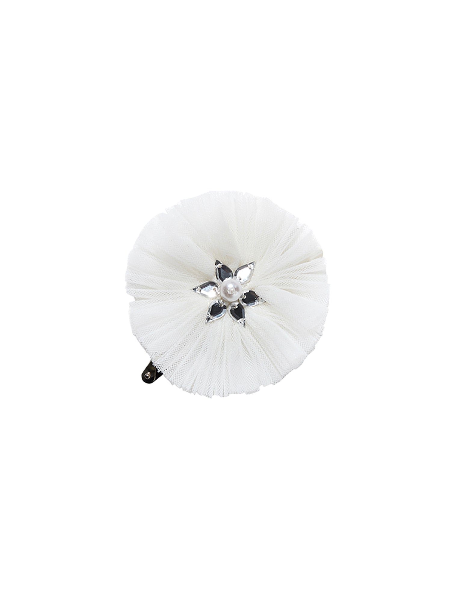 Complete your look with the Snow Kissed Hair Clip in Milk. This shimmering accessory Features a beautiful single flower delicately formed from layers of tulle to create a stunning blossom. It's decorated with a sparkling cluster of beads to form a glittering snowflake studded with a glimmering pearl bead. The layered tulle sits atop a metallic silver clip.