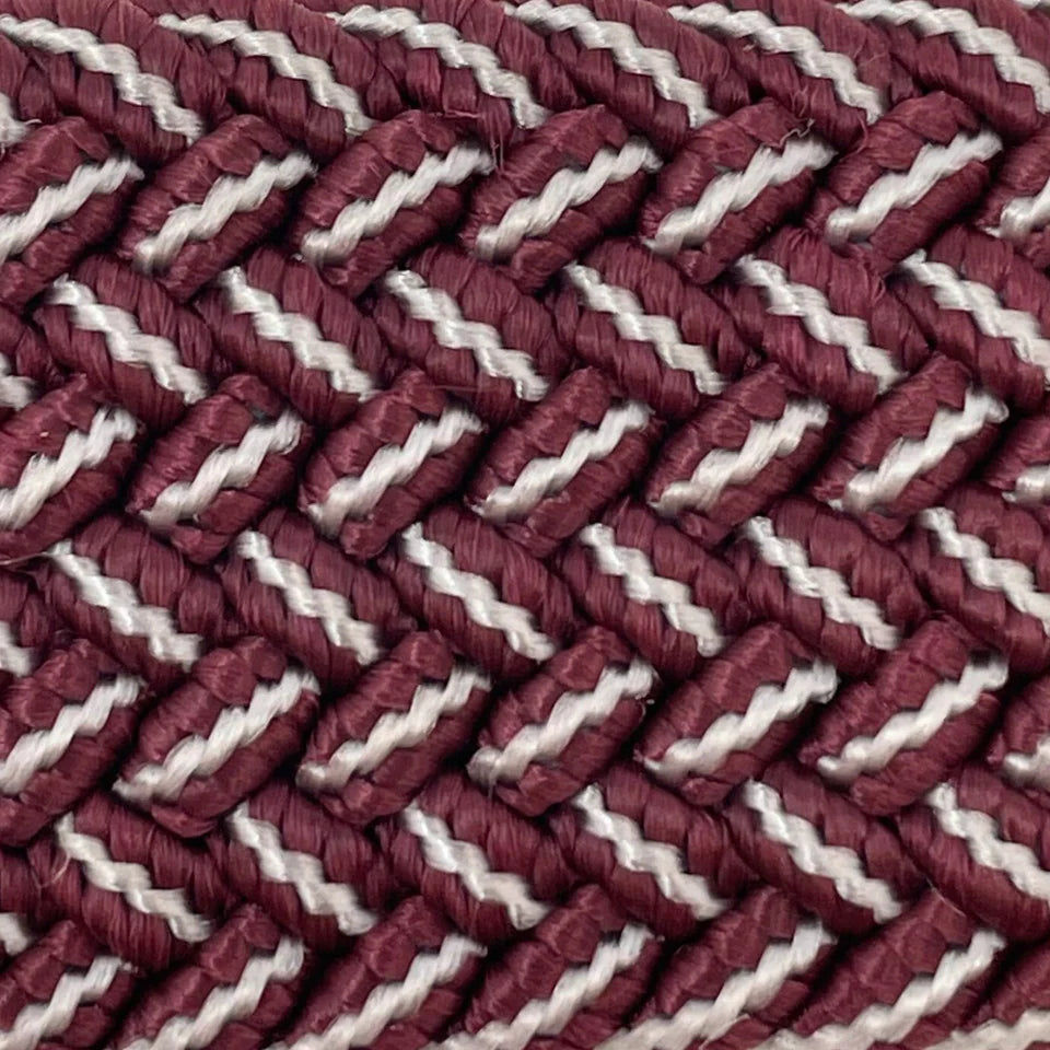The Biloxi two-toned woven elastic-stretch belt. Maroon and Grey Belt with a rounded buckle and dark brown leather finish stamped with the Roostas logo. An adjustable clasp goes through the woven belt, allowing for adaptable sizing. Designed for comfort both on and off the course.