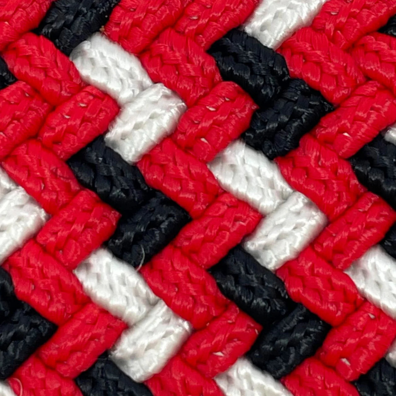 The Lil' Sea Island kid's tri-color woven stretch belt. Red, Black and white belt with a rounded buckle and dark brown leather finish stamped with the Roostas logo. An adjustable clasp goes through the woven belt, allowing for adaptable sizing. Designed for comfort both on and off the course.