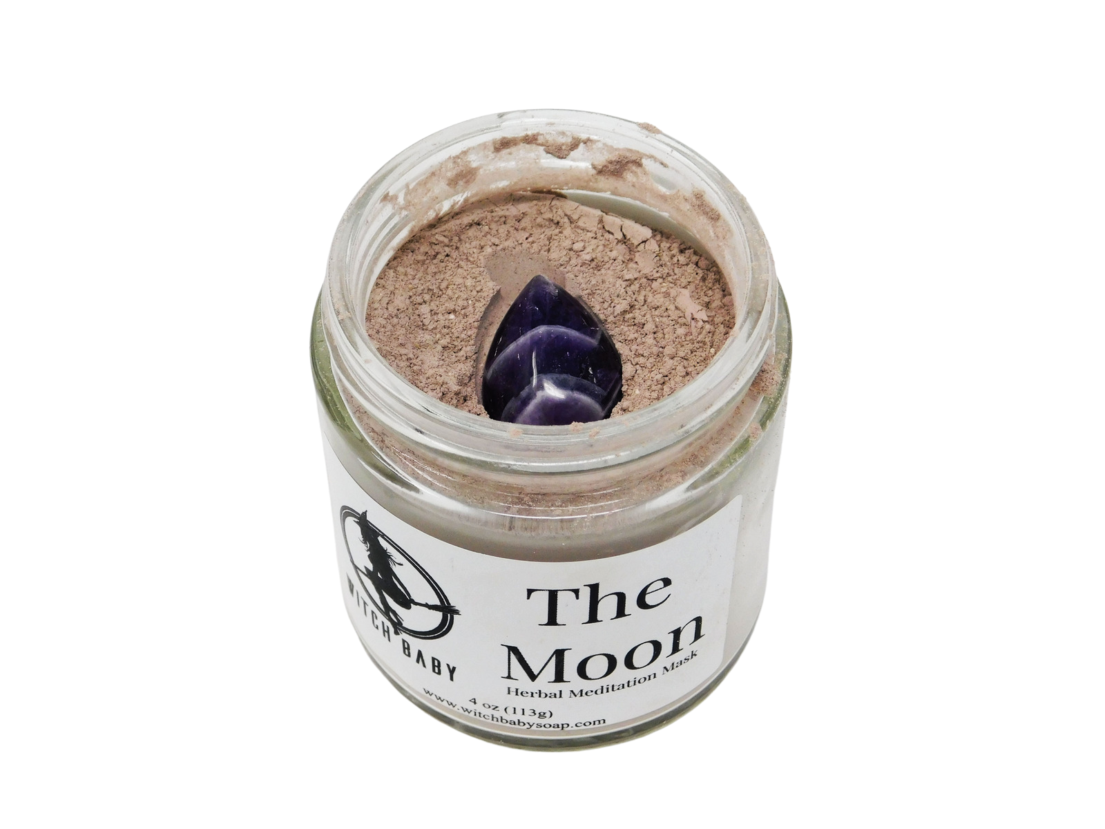 The Moon is an otherworldly face mask. It's hand blended with a variety of psychic herbs that contain a wide variety of vitamins, minerals, antioxidants, and nutrients. The Moon invites us to look within and trust our intuition. Cooling and calming lavender helps take us to a place of serenity while blue vervain, yarrow, myrrh, and angelica awaken our psychic abilities. Each jar of The Moon comes with a tear drop shaped piece of amethyst to assist in meditation.